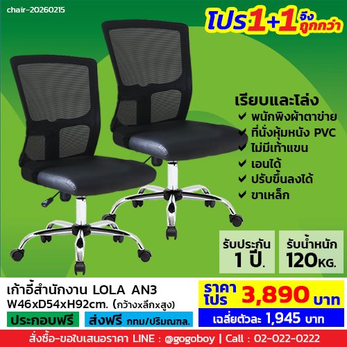 โปร 1+1 จึงถูกกว่า (1โปรได้2ตัว) เก้าอี้สำนักงาน ไม่มีเท้าแขน LECCA เล็คก้า รุ่น โลล่า LOLA AN3